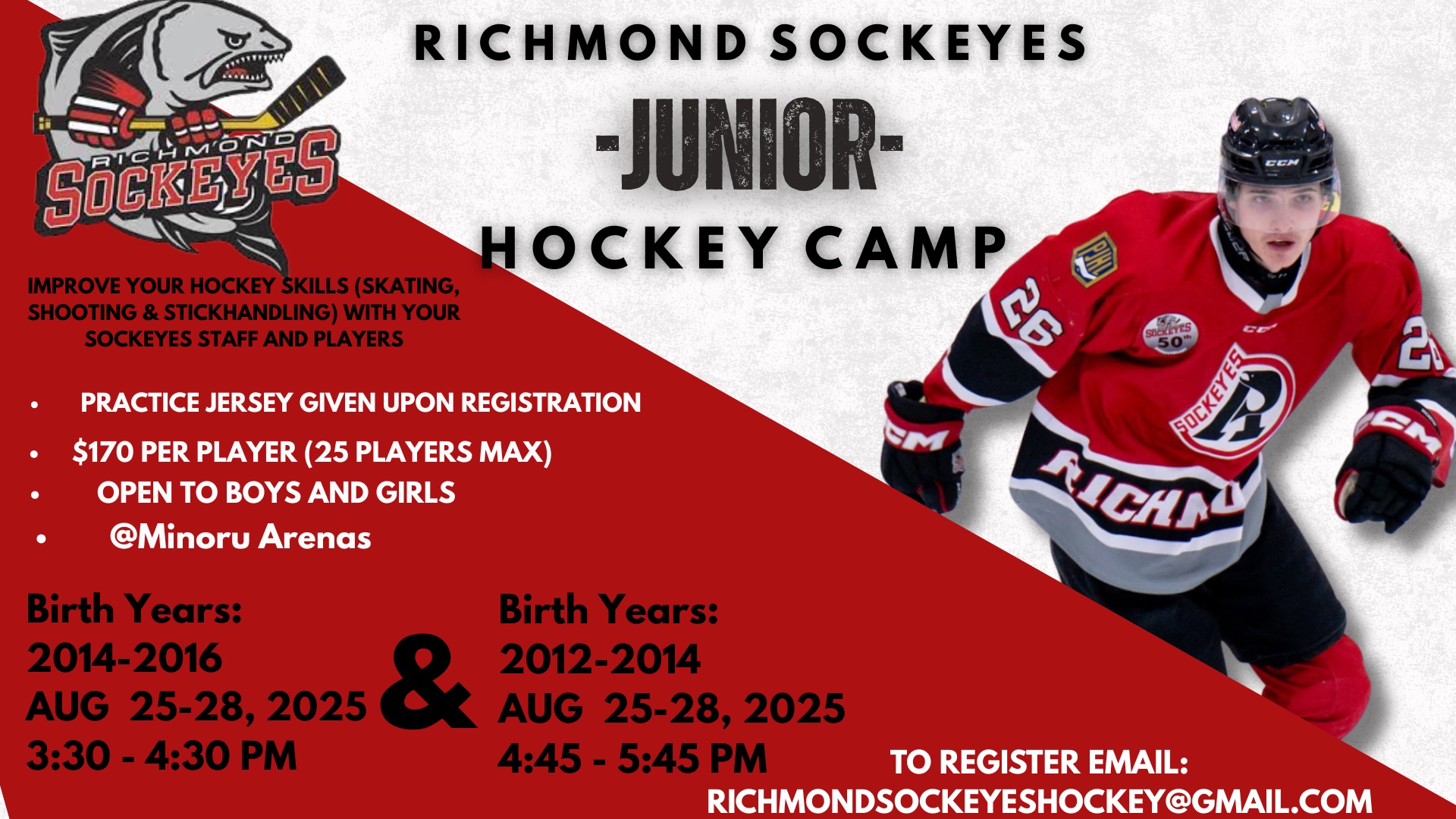 Improve our hockey skills (skating, shooting and stickhandling) with your Sockeyes staff and players! Practice Jersey given upon registration $170 per player (25 players max) Open to boys + girls Taking place @ Minoru Arenas TO REGISTER OR FOR ANY INQUIRIES, EMAIL: richmondsockeyeshockey@gmail.com